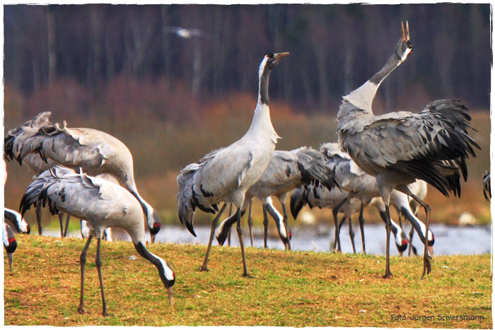 Toll anzusehen sind die Kranichtänze. Durch Sprünge, Verbeugungen, Flügelschlagen, Zickzackläufe oder im Kreis rennen, möchten sie ihre Artgenossen beeindrucken. Ganz besonders in der Balzzeit, wenn sie um ihre Partner werben, kann man diese Tänze sehen, manchmal sogar ein richtiges Kranich-Ballett, wenn sich viele Kraniche anstecken lassen.